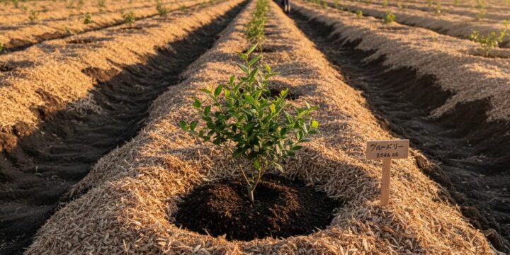 黒く見えているところは、堆肥によるマルチングを行っています。