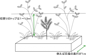 何年もかけて育て切り戻しを繰り返してきたけれど、全体に大きくなってきてどれを目安にしていいか分からなくなってきたときは、一つポイントがあります。花壇の奥行きの一番あるところの長さを測ります。(これをDとします)、奥行きの長さ(D)の1~1.5倍くらいを目処に植物の一番大きなもののトップに切り戻します。すると翌シーズンはトップの大きさは奥行き(D)の1.5~2倍程度のサイズに収まり全体のバランスが良い状態を保てるようになります。